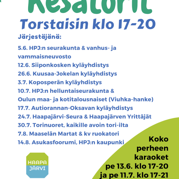Etusivu Muuttajalle Matkailijalle Yrittäjälle Pikalinkit Avoimet työpaikat Tapahtumat Pöytäkirjat ja esityslistat Kuulutukset Tontit Kartat Eläinlääkäripalvelut Ajankohtaista Näytä kaikki ajankohtaiset 04.12.2025Uimahallin aukioloajat joulun aikaanUimahallin joulun ajan aukioloajatLa 6.12. suljettusu 21.12. - ma 29.12. suljettuke 31.12. ja to 1.... Lue uutinen 17.11.2025Tiedote 17.11.2025Tiedote 17.11.2025 Pohjois-Pohjanmaalla Haapajärven Settijärvellä on todettu laulujoutsenessa... Lue uutinen 06.11.2025Äänestä vuoden 2025 haapajärvistä!Vuoden 2025 haapajärvisen valintaperusteina voivat olla esimerkiksi Haapajärven tunnetuksi... Lue uutinen 30.10.2025Kutsu malminetsinnän yleisötilaisuuteen Gemdale Limited kutsuu teidät tervetulleeksi malminetsinnän yleisötilaisuuteen, jossa käsitellään... Lue uutinen 29.09.2025Vuosiavustukset 2026 haettavinaHaapajärven kaupungin kulttuuri-, liikunta- ja nuorisopalvelujen vuosiavustukset vuodelle 2026 ovat... Lue uutinen 14.08.2025Koululaisten ilmaisuinnitHaapajärven kaupunki/liikuntapalvelut tarjoaa jälleen tuttuun tapaan esi-, ala- ja yläkoululaisille... Lue uutinen 10.07.2025Jokilatvan opiston kurssi-ilmoittautuminen käynnistyy 11.8.2025Jokilatvan opiston lukuvuoden 2025-2026 opinto-ohjelma on julkaistu. https://www.jokilatvanopisto.... Lue uutinen 13.05.2025Rakennusvalvonnan kesätiedote 2025Rakennusvalvonta on suljettu 7.7.-3.8.2025. Tänä aikana ei tehdä päätöksiä eikä suoriteta... Lue uutinen 09.04.2025Matkahuollon Pakettipiste muuttaa työpaja WarikolleMatkahuollon Pakettipiste muuttaa työpaja Warikon tiloihin Koulukadulle. Matkahuollon... Lue uutinen 21.02.2025Esiopetuksen tiedotustilaisuus to 27.2.2025 klo 18.30Esiopetuksen tiedotustilaisuus syksyllä 2025 alkavaan esiopetukseen järjestetään kaupungintalon... Lue uutinen 21.02.2025Vapaaehtoinen latumaksuVAPAAEHTOINEN LATUMAKSU LATUJEN KUNNOSSAPIDON TUEKSI Haapajärven kaupungin säästöohjelman... Lue uutinen 19.02.2025HSM-kerhon vetäjäksi?Tulevan lukuvuoden kerhotarjontaa suunnitellaan jo! Olisiko sinulla mahdollisuutta ja halua toimia... Lue uutinen 19.02.2025Jokilaaksojen Nuorten Tuki ry kuntatiedote... Lue uutinen 12.02.2025Kaupungin kesätyöpaikat haussa 17.2.–14.3.2025Kesätyötä voivat hakea 15–20-vuotiaat haapajärviset nuoret, joiden kotikunta on hakuajan päättyessä... Lue uutinen 12.02.2025Liikuntatoimen kuntokampanjassa mukanaLiikuntatoimen kuntokampanjassa mukana myös Muovi-Set Finland Oy/Speedy Ski Roller/Markku Salmela.... Lue uutinen 28.01.2025Maakuntaviestin palkinnotNyt on saatu maakuntaviestin tuoreetkin palkinnot kaiverrettuina esille monarin vitriiniin.... Lue uutinen 13.01.2025TE-palvelujen yhteystiedotVuoden 2025 alusta lähtien järjestämme työvoimapalvelut yhdessä Raahen työllisyysalueen kuntien... Lue uutinen 07.01.2025Muistoja kesältä 2024Katso video klikkaamalla linkkiä:HELLAPOLIISI_HAAPAJARVI.mp4... Lue uutinen 20.12.2024TE-palveluista tulee kunnan palveluita 1.1.2025Pohjois-Pohjanmaan TE-toimisto ja työllisyyden kuntakokeilut lopettavat toimintansa vuoden lopussa... Lue uutinen 19.12.2024Kuntokampanja 2025Haapajärven liikuntatoimen kuntokampanja 2025 (1.1. - 31.3.)!-Hyvä olo liikkumalla *Kirjaa... Lue uutinen Haapajärvellä tapahtuu Ilmoita tapahtuma Näytä tapahtumakalenteri 14.12.2025 klo 14:15Kiekkokoulu 3-8 vuotiailleTervetuloa opettelemaan luistelun ja jääkiekon alkeita leikin avulla. Luistellaan, leikitään ja... Lue lisää 15.12.2025 klo 18:00Haapajärvi2026 - Kulttuuripääkaupunkivuoden tapahtumainfo ja...Tule kuulemaan miten kulttuuripääkaupunkivuosi Oulu2026 näkyy Haapajärvellä. Mitä täällä tapahtuu... Lue lisää 18.12.2025 klo 18:00JoulutunnelmauintiJoulutunnelmauinti torstaina 18.12.2025 klo 18-20.30. Joulumusiikkia & kynttilöitä, normaali... Lue lisää 20.12.2025 klo 19:00Meidän joulu -konserttiSuomenselän Osuuspankki tarjoaa kaikille avoimen ja ilmaisen joulukonsertin Haapajärven kirkossa... Lue lisää 30.12.2025 klo 15:00Elokuvat HaapajärvelläElokuvapäivän elokuvat:Klo 15.00 Zootropolis 2 - eläinten kaupunki -k7/4-Klo 17.00 Teräsleidit -... Lue lisää Haapajärvellä tapahtuu Ilmoita tapahtuma Näytä tapahtumakalenteri 04.12.2025 klo 11:00 - 02.01.2026Jouluisia kuviaJouluisia kuvia nähtävänä kirjastossa. ... Lue lisää 15.12.2025 klo 12:00 - 21.12.2025Möttösperän pieni joulukauppaPaljon ihania käsintehtyjä lahjoja: mattoja, käsinkudottuja kaita-ja laudeliinoja, neuleita,... Lue lisää 08.01.2026 klo 11:00 - 30.01.2026Magenta ja ultramariiniLotta Puurulan taidenäyttely Magenta ja ultramariini Haapajärven kirjastossa tammikuussa 2026.... Lue lisää Tulevat järjestöilmoitukset Tee järjestöilmoitus Näytä järjestöilmoitukset Seuraa meitä somessa Haapajärven kaupunki Facebookissa Haapajärven kaupunki Instagramissa