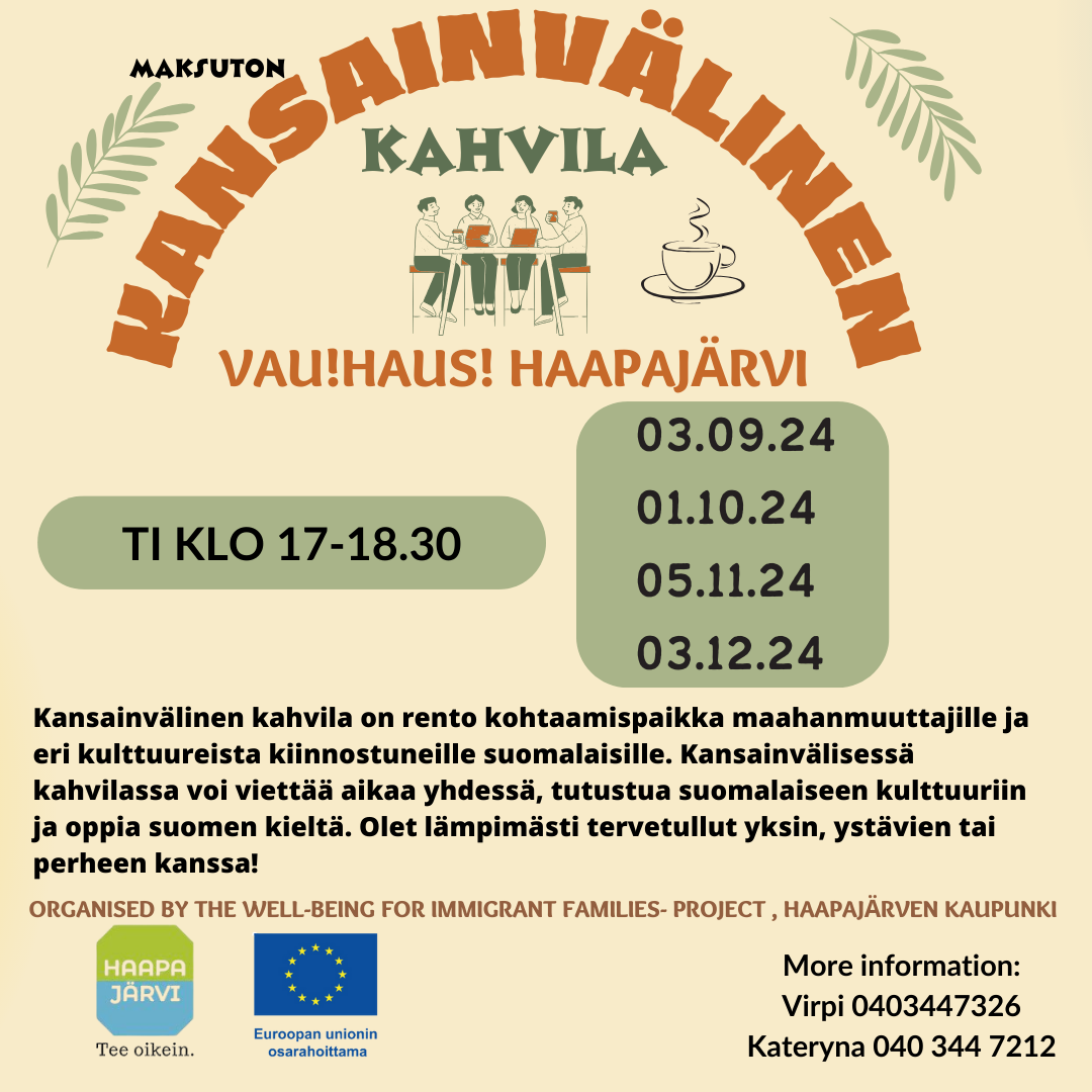Kansainvälinen kahvila on rento kohtaamispaikka maahanmuuttajille ja eri kulttuureista kiinnostuneille suomalaisille. Kansainvälisessä kahvilassa voi viettää aikaa yhdessä, tutustua suomalaiseen kulttuuriin ja oppia suomen kieltä. Olet lämpimästi tervetullut yksin, ystävien tai perheen kanssa!
