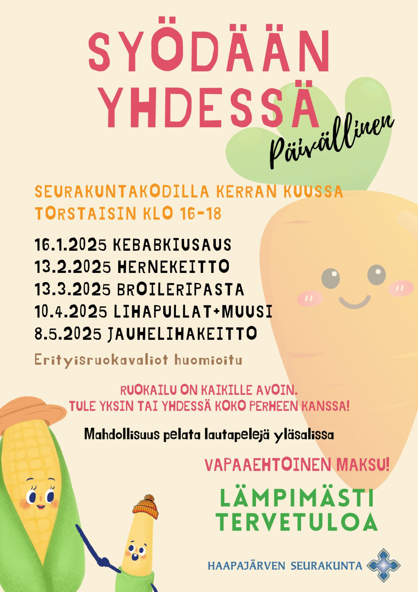 Syödään yhdessä päivällinen Seurakuntakodilla. Ruokana hernekeittoa, jälkiruoaksi pannaria. Ruokailu on kaikille avoin, vapaaehtoinen maksu. Mahdollisuus pelailla lautapelejä yläsalissa. Lämpimästi tervetuloa!