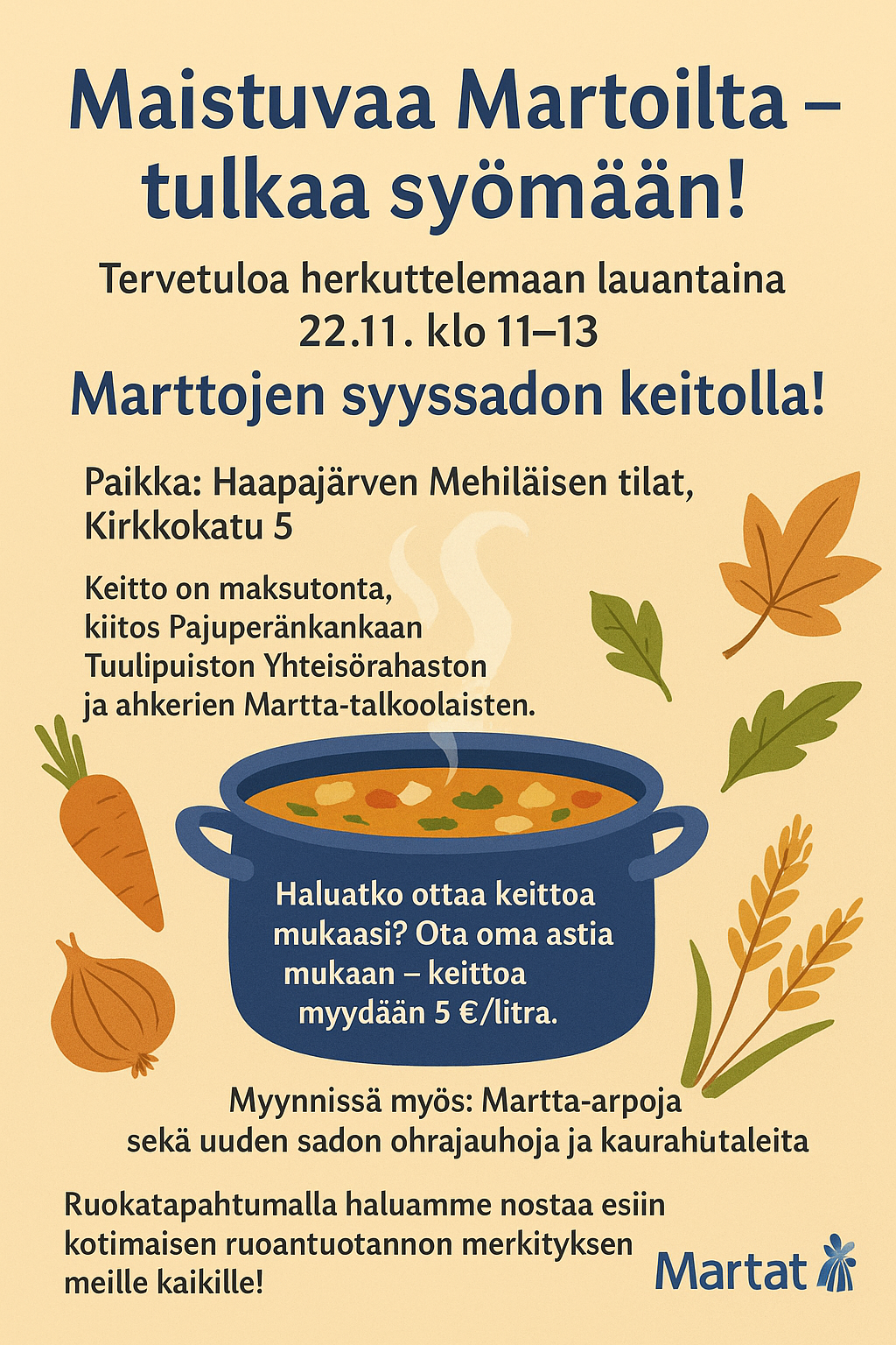 Martat kutsuvat kaikki syömään Syyssadon Keittoa la 22.11.2025 klo 11-13 Mehiläisen toimitiloihin Haapajärvellä. Maksuttomalla ruokatapahtumalla haluamme korostaa kotimaisen ruoantuotannon merkitystä ja korostaa yhteisöllisyyttä.