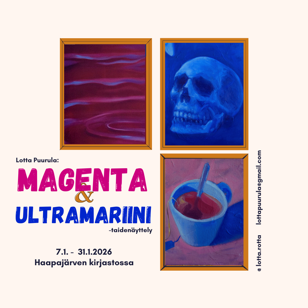 Lotta Puurulan taidenäyttely Magenta ja ultramariini Haapajärven kirjastossa tammikuussa 2026.