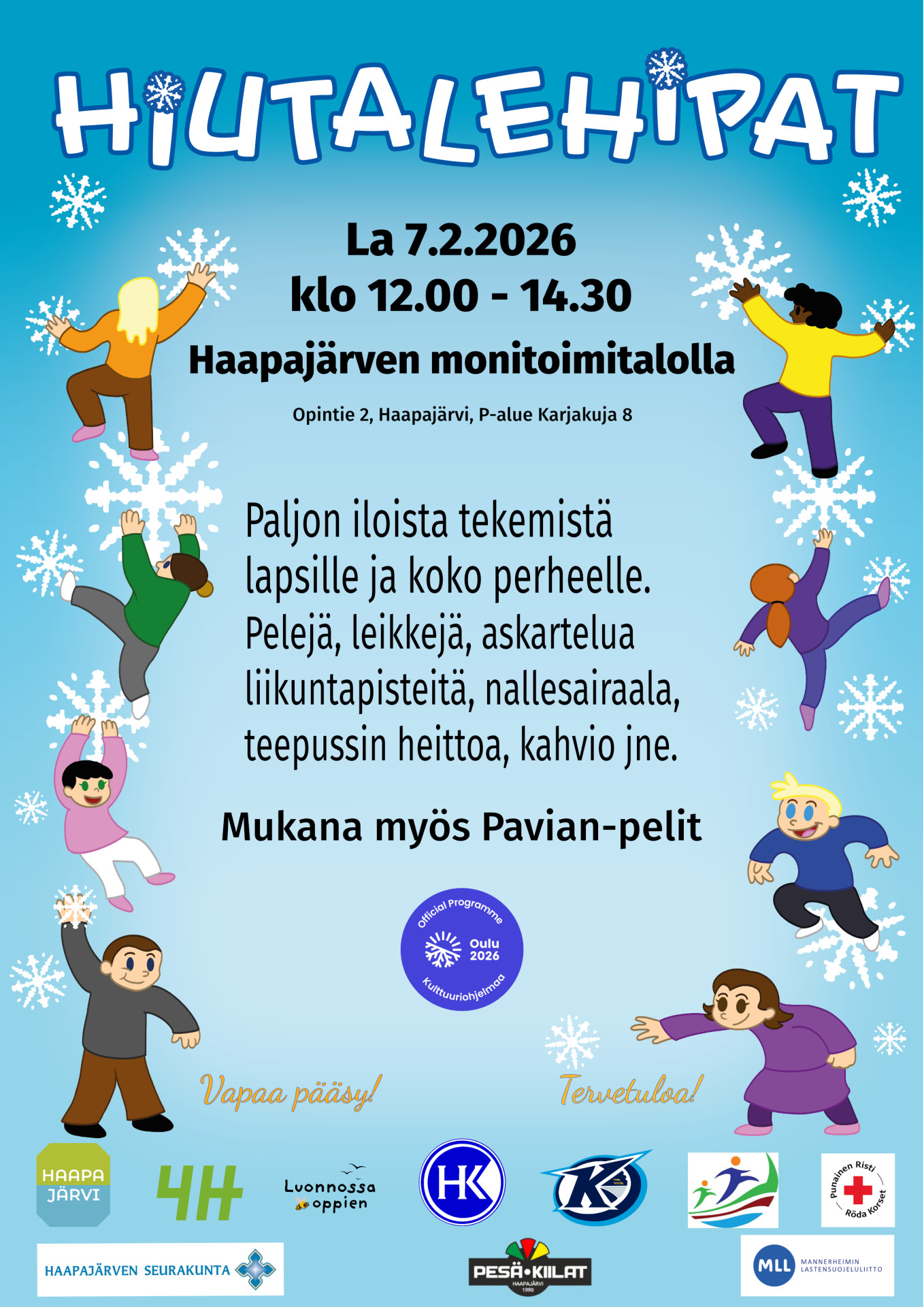 Maksuton Hiutalehipat -tapahtuma kutsuu lapset, lapsiperheet ja leikkimieliset aikuiset erilaisten toimintapisteiden äärelle lauantaina 7.2.2026 klo 12–14.30. Monitoimitalon salitilat, huoneet ja aulatilat ovat täynnä erilaisia liikunta-, seikkailu-, peli-, askartelu- ja leikkipisteitä. Tapahtumassa pääsee tutustumaan myös eri maiden leikki- ja peliperinteeseen. Aulasta löytyy kahvio.